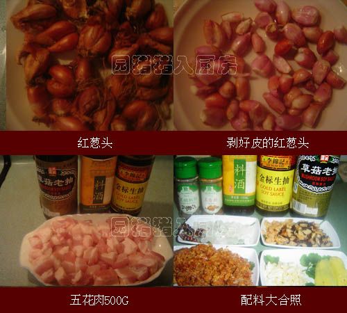 配料大合照左边那一小碟就是压碎的红葱头酥了。。以前买不到那个,我用洋葱代替的,后来婆婆告诉我,台湾卤肉一定要用红葱头才香。。。我自己觉得差不了多少。