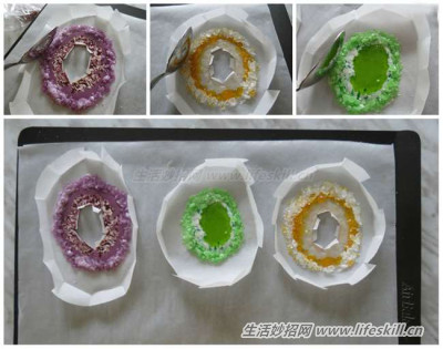 送进烤箱 150 度烤大约 4 分钟,烤的时候最好要观察一下,糖融化了就可以拿出来了,千万不要让它融化得太厉害,不然做出来的糖果就会太薄了。然后,小心的加上第二圈糖。