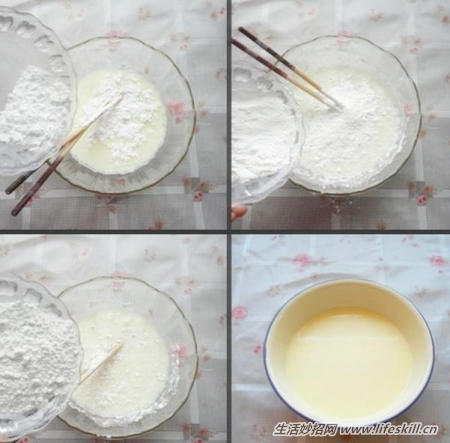 第一步:混合做冰皮的材料,并搅拌均匀。先在牛奶中加入色拉油,搅拌均匀后,再把所有的糖类和粉类倒入油奶混合物中搅拌,当面糊呈现出像浓稠酸奶一样的状态时就搅拌好了。
