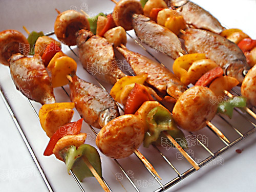 4、将食材依次串好,用小刷子将酸辣汁抹在串儿上(鱼肚子里也抹)