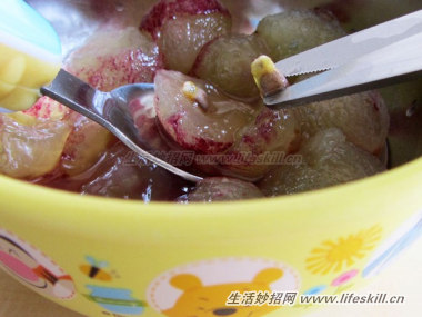 4.汤匙轻压葡萄,用剪刀将葡萄籽夹起来。是不是很简单呢?