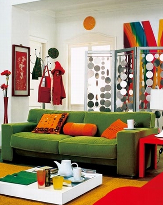 如果觉得家装抢眼的设计难以搭配,不妨考虑下屏风。粉红色的沙发床、红木茶几、盛开的花朵,这华丽的一切都比不上沙发床后的一道红屏风。