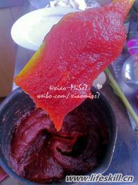 压碾果泥其间感觉粘稠不易操作,不断用煮山楂的水稀释一下再挤压