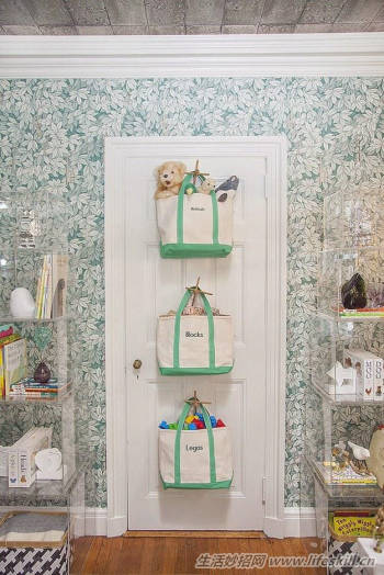 床旁边放一个收纳袋,孩子可以轻松拿起自己的心爱之物,还可以避免硬硬的床脚磕到孩子