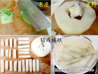 1.将冬瓜皮切除,去籽,切成条状。(可用汤匙来去籽,一片冬瓜约可切成24条)