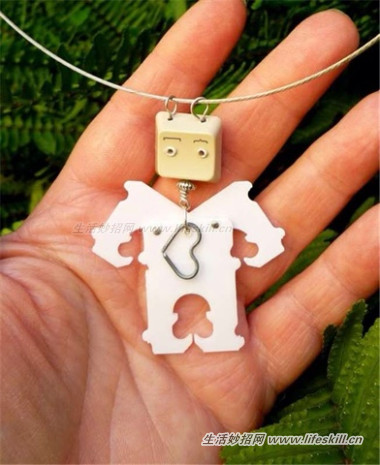 因为 Bread Clips 的形状很特别,所以你也可以发挥自己的创意,和其他废弃的小东西组合一下,像下面这个范例还结合了一块键盘上的按键呢,是不是很特别呢~~