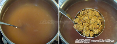 1. 将片状的莲藕粉捏碎备用。锅子盛装过滤水煮滚熄火,分次均匀少量地洒下莲藕粉,一边用汤匙搅拌。