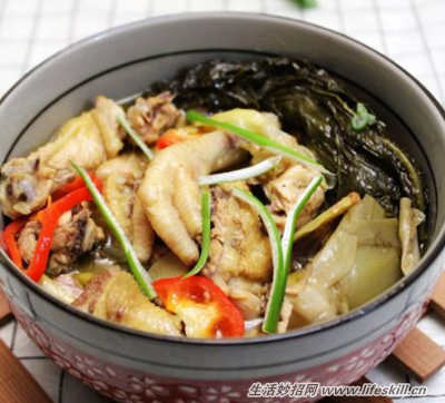 原材料:土鸡750g、酸菜300g、葱段适量、盐适量、生姜片适量、胡椒粉适量、杭椒丝少量
