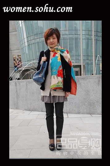 这个颜色的外套很难穿,外国人多会把它穿的坦胸露乳,却是不适合俺们东方人的风格。图中的这位mm用一字领和小围巾轻松的化解了这个难题,包括别出心裁的搭配中裤,虽然每样东西都很简单,但也实在是很耐寻味的呢。