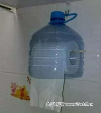 5.色拉油桶剪开,穿根筷子就做成了个简便的卫生纸架,还买什么卫生纸盒啊!