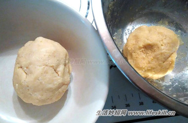 5.一块加入黑芝麻,另外一块加入香菜粉后揉匀。