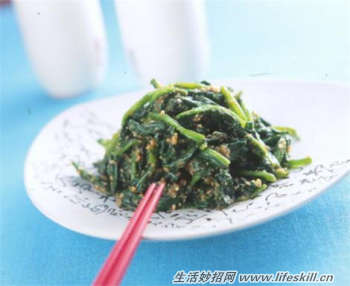 2.取小碗放入所有调味料调匀,再放入作法1的菠 菜拌匀即成。