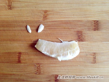 3. 接着处理果肉的部分,将白膜去除,取下一小片果肉,在两个边缘处,各切掉一个小角。