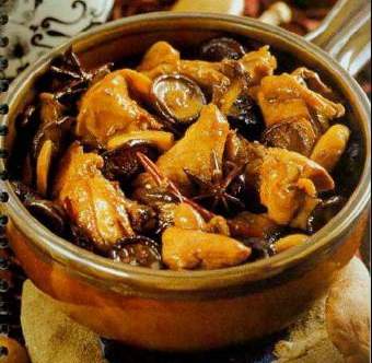 用料:嫩鸡1只(1000g),干香菇50克,豆瓣25克,花椒1茶匙(5克),精盐1茶匙(5克),老姜50克,大葱10克,鸡精1茶匙(5克),料酒2茶匙(10毫升),酱油2茶匙(10毫升),冰糖25克,油50毫升,八角2粒
