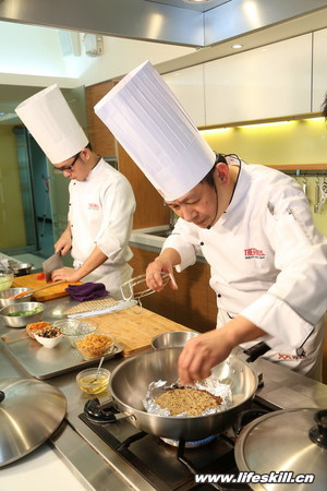 打破一般人对于年菜制作麻烦又费时费工的印象,中华美食交流协会现任理事长施建发掌握锅具特性烹煮菜肴,例如运用省力省能源的真空焖烧锅,先在内锅爆香佛跳墙食材,再将内锅移入外锅焖煮即可,不仅能保留烹煮热能,让料理从四面八方均匀受热,还能抓紧时间料理下一道菜。
